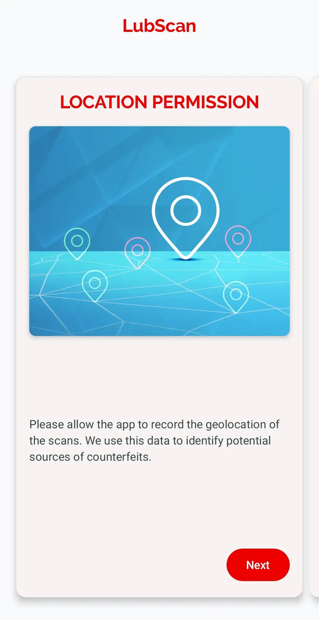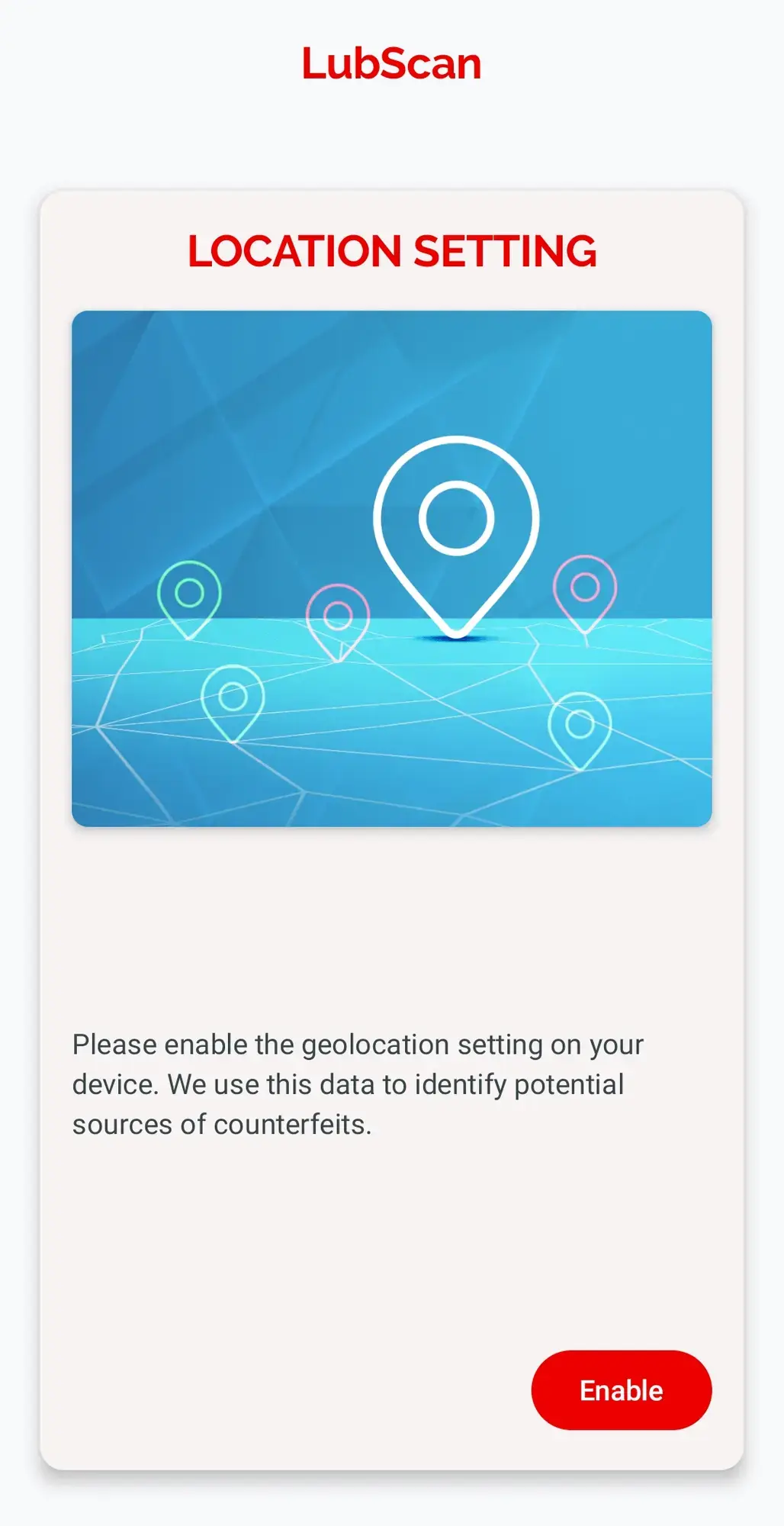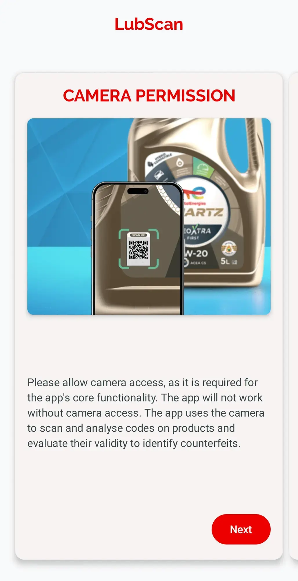 Необхідно для прив'язки каталогу продукції локального представництва TotalEnergies - Після надання дозволів та включення функції геолокації, відкриється функціонал для перевірки через повторне сканування QR коду в LubScan by TotalEnergies